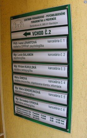 Ide o elegantnú orientačnú tabuľu o rozmere 165 x 120 cm, ktorá je vyhotovená z 5 mm hrubého plexiskla. Horizontálne pásy sú nalepené v zadnej časti plexiskla. Samotné texty sú vyrezané samostatne zo samolepiacej fólie a nalepené z prednej časti plexiskla, tak aby vytvárali pod textom efektný tieň. Zároveň v prípade potreby sa dajú tieto texty jednoducho aktualizovať ich odlepením a nalepením...